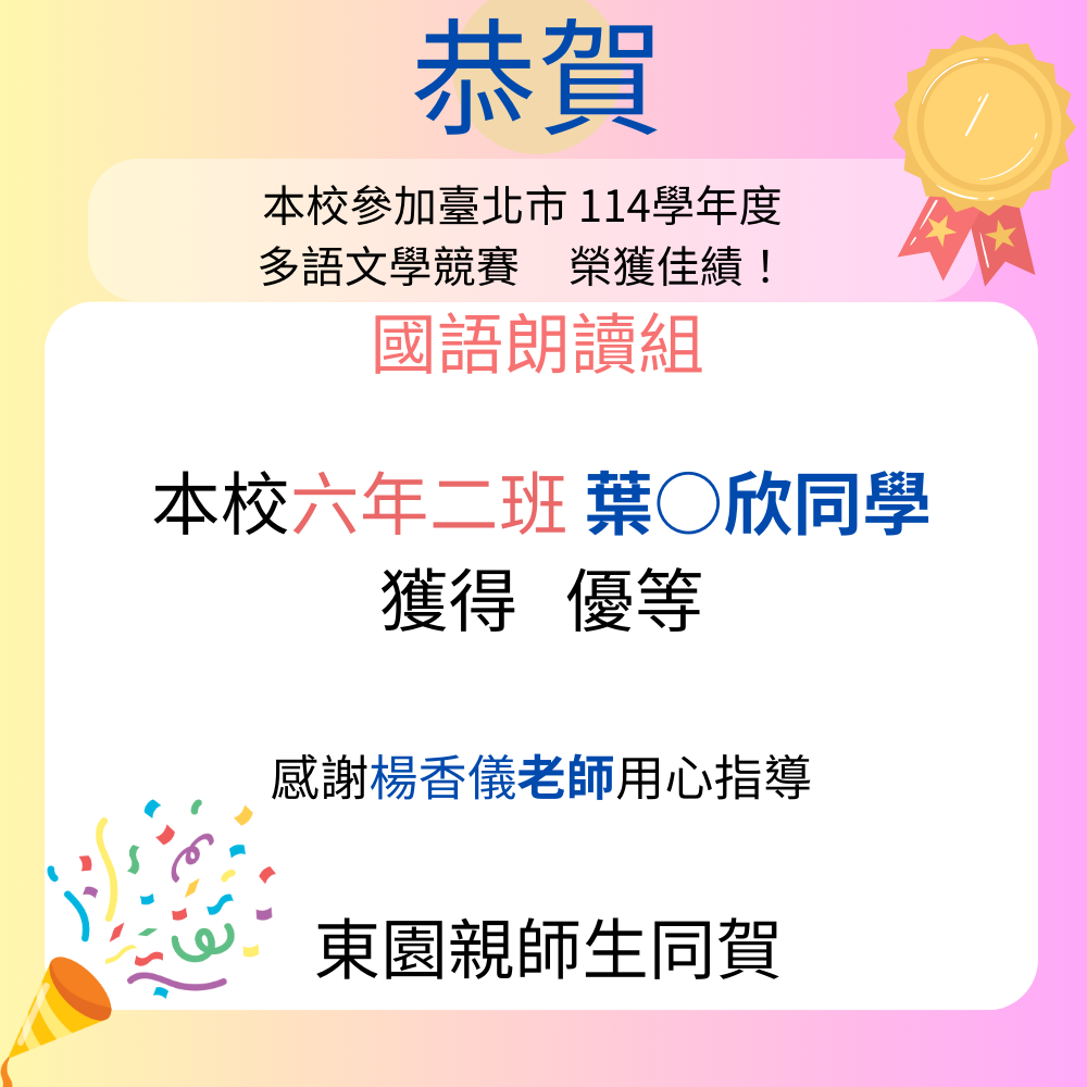 恭賀!本校605班 葉0欣同學 榮獲市語文競賽 國語朗讀組 優等