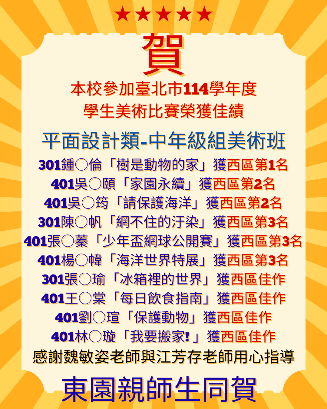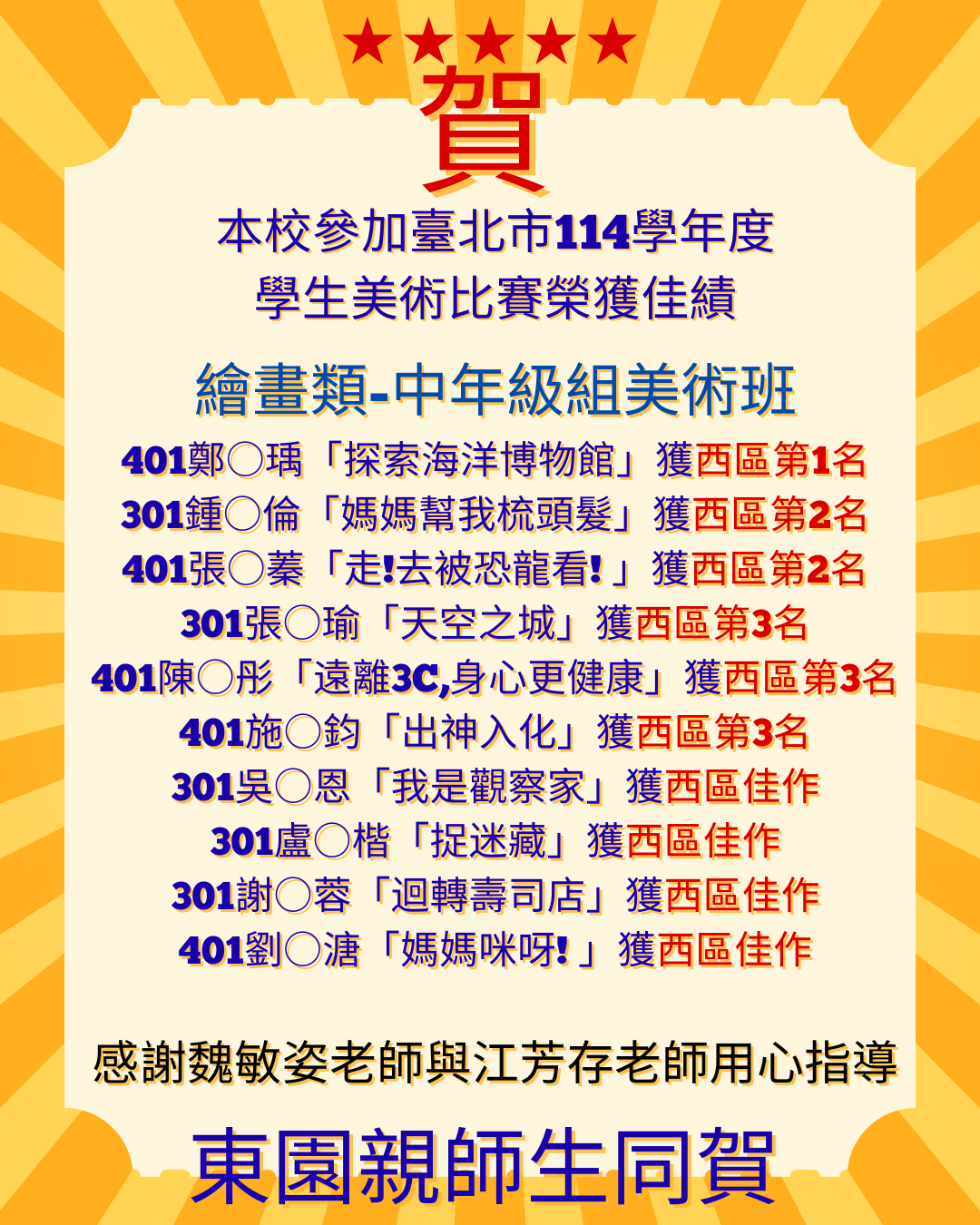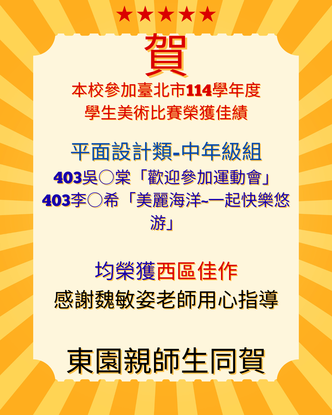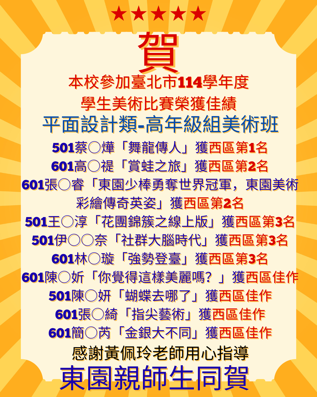 平面設計類高年級美術班 本校501伊○○奈榮獲西區第3名