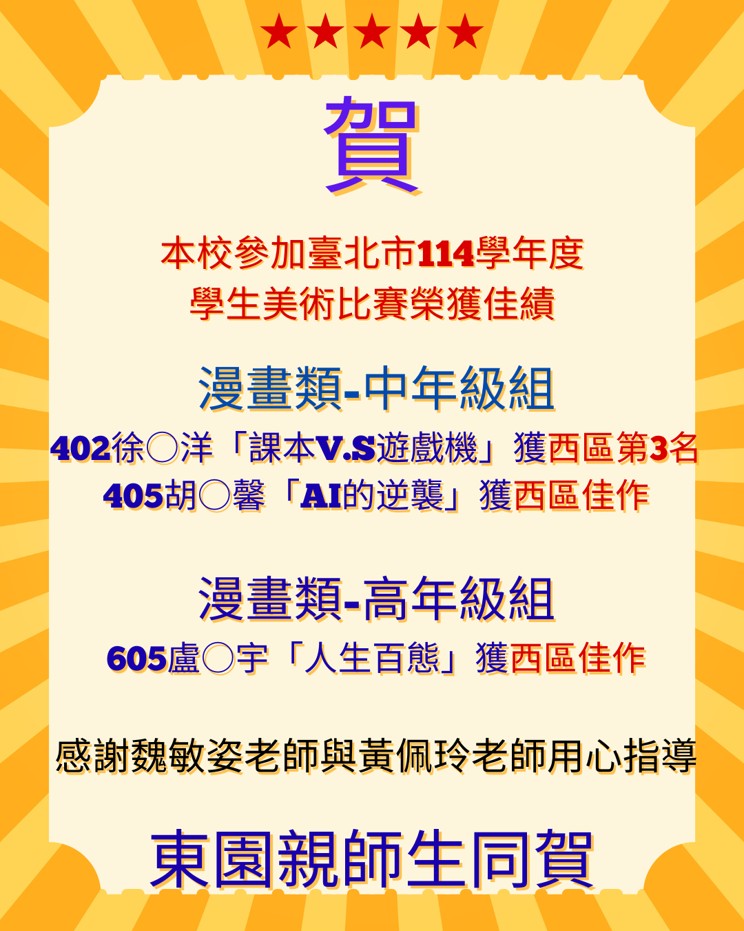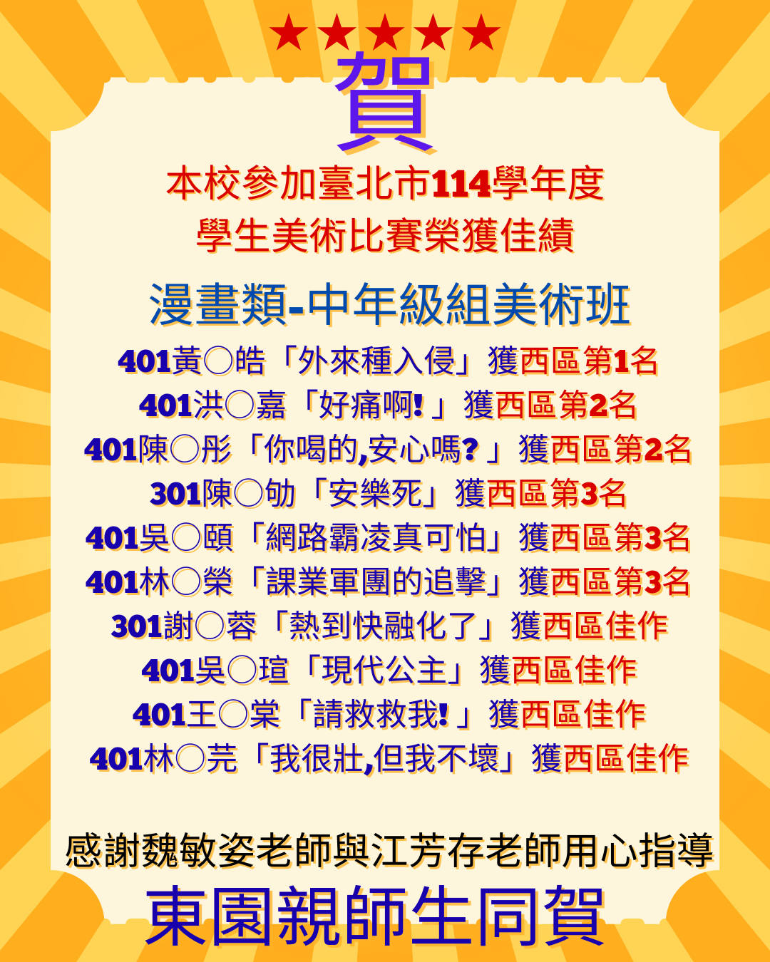 漫畫類中年級美術班 本校401吳○頤榮獲西區第3名