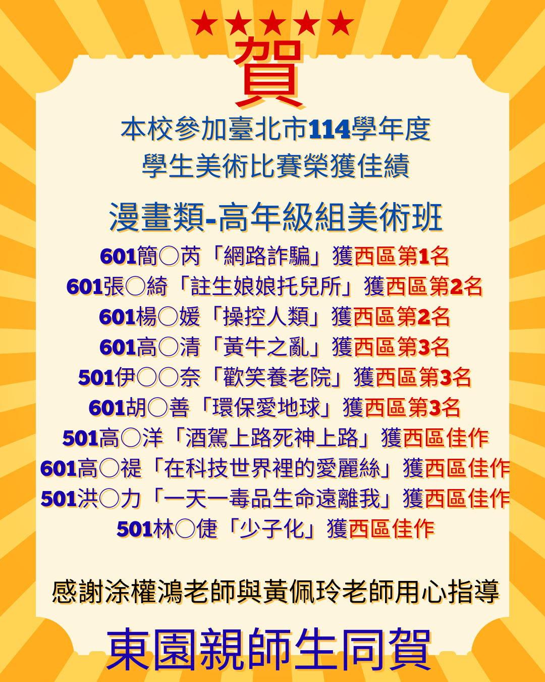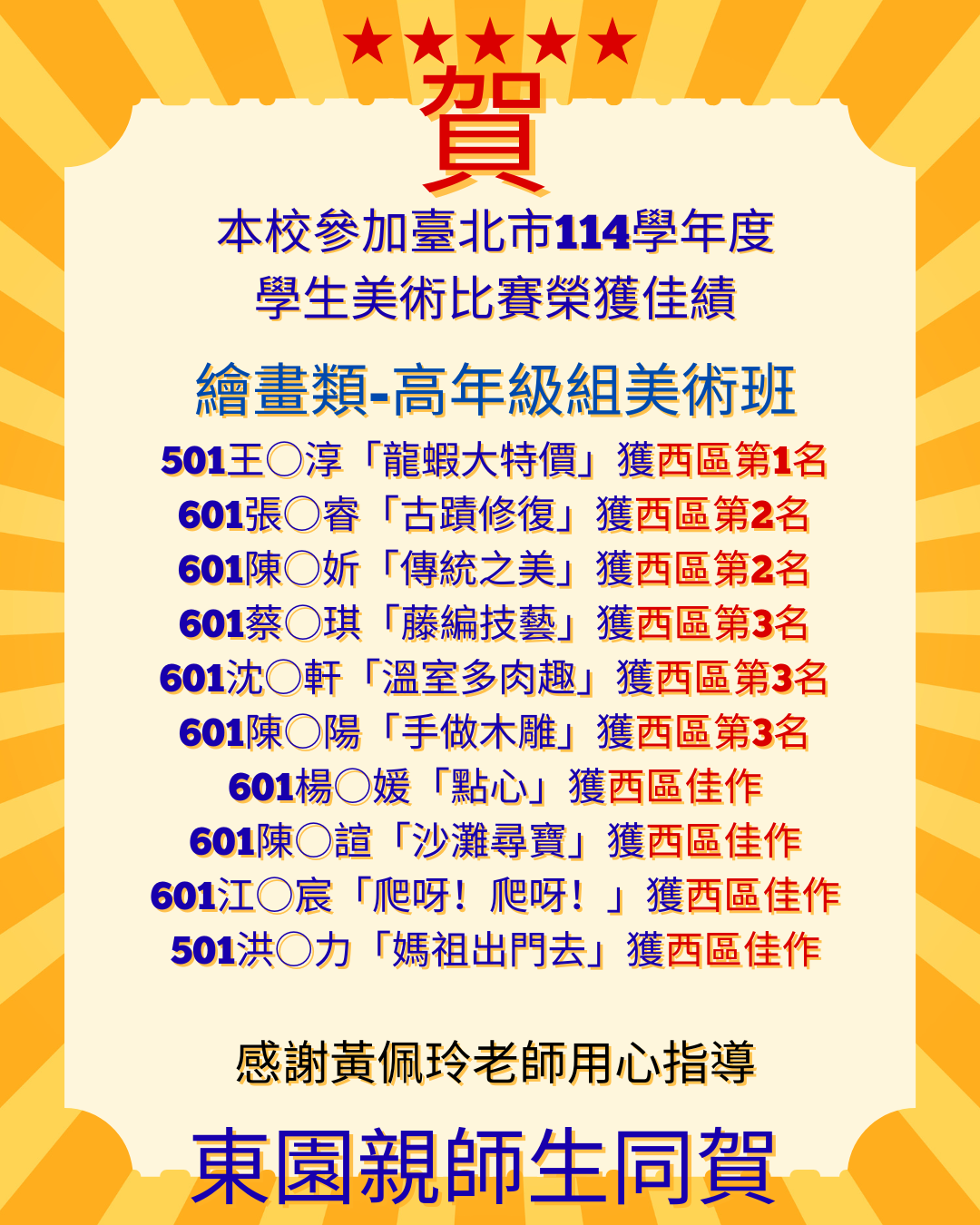 平面設計類高年級美術班 本校601高○禔榮獲西區第2名