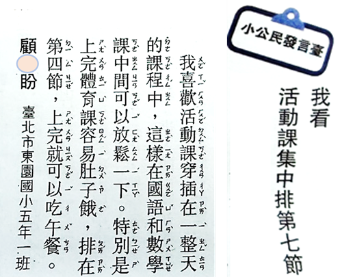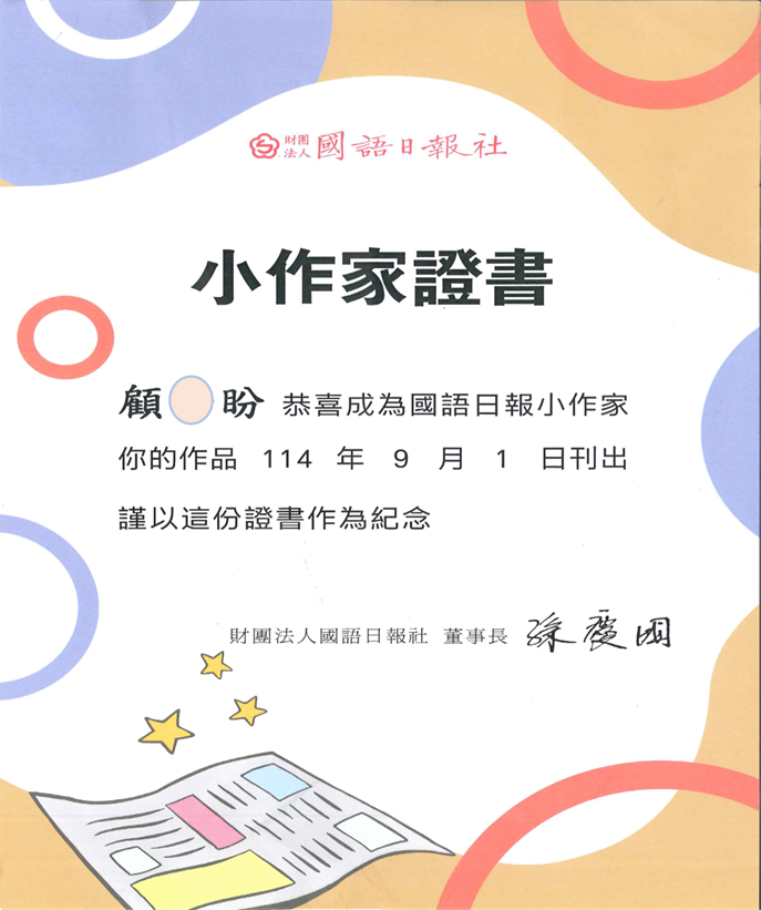 賀!本校五年一班顧○盼同學投稿國語日報《小公民發言臺》榮獲114年9月1日刊登,並獲得【國語日報小作家證書】。