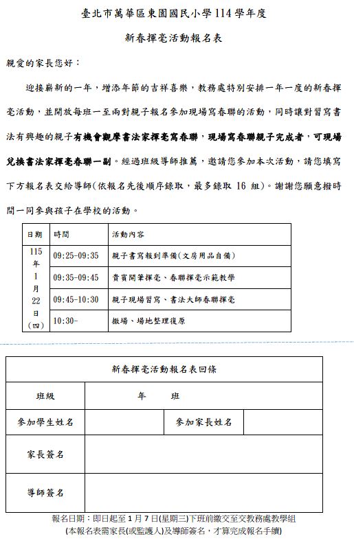 1/22(四)09:30-10:30於樂育堂辦理親子新春揮毫活動,主題為「馬耀東園,禮行交安」,已發給三至六年級各班報名表,歡迎有意願參與的家長偕同學生報名。