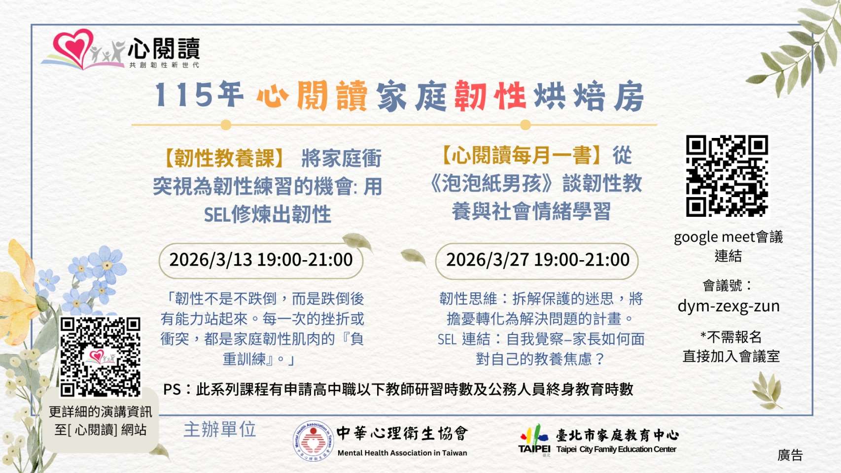 家長好~轉知~教育部及北市家庭教育中心的親職講座及親職資源,敬請參閱附件~